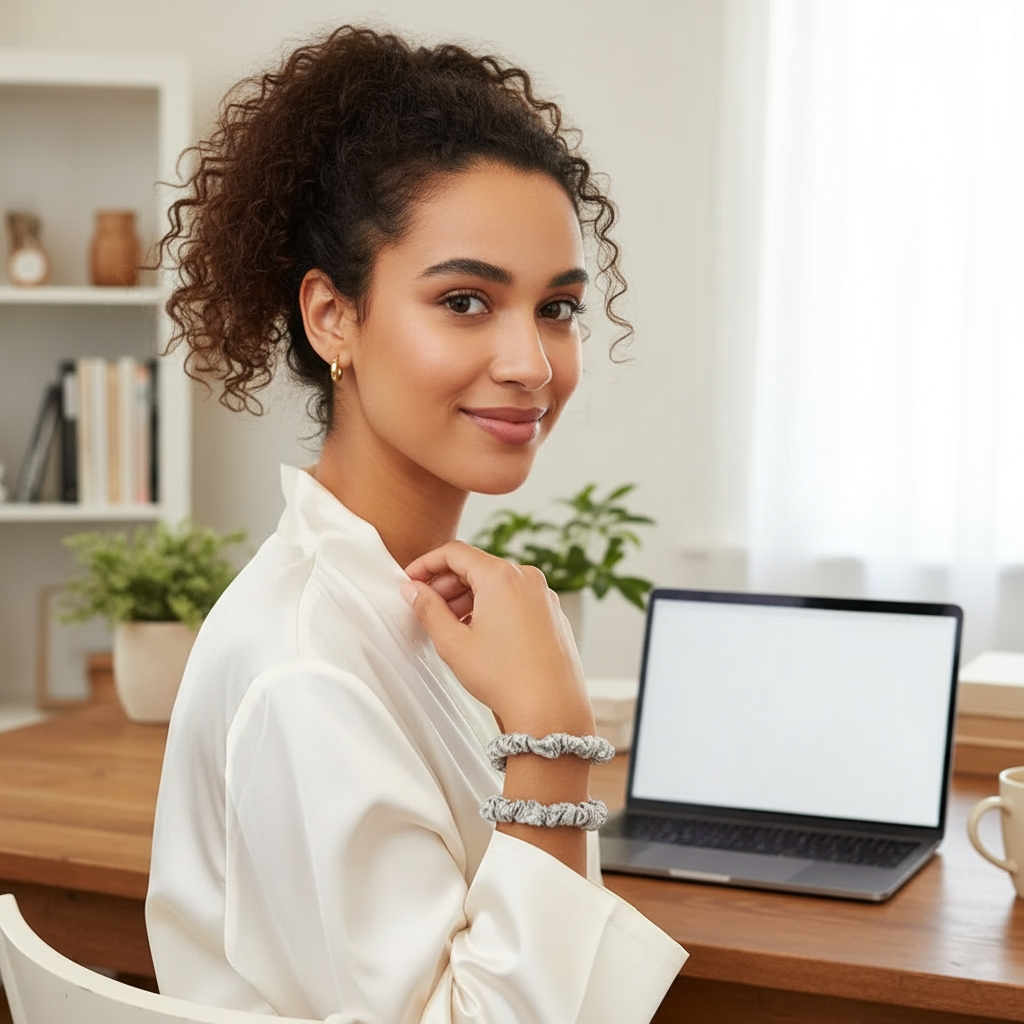 Whether you’re styling for the day or sleeping through the night, our silk scrunchie keeps your hair polished, healthy, and effortlessly beautiful.